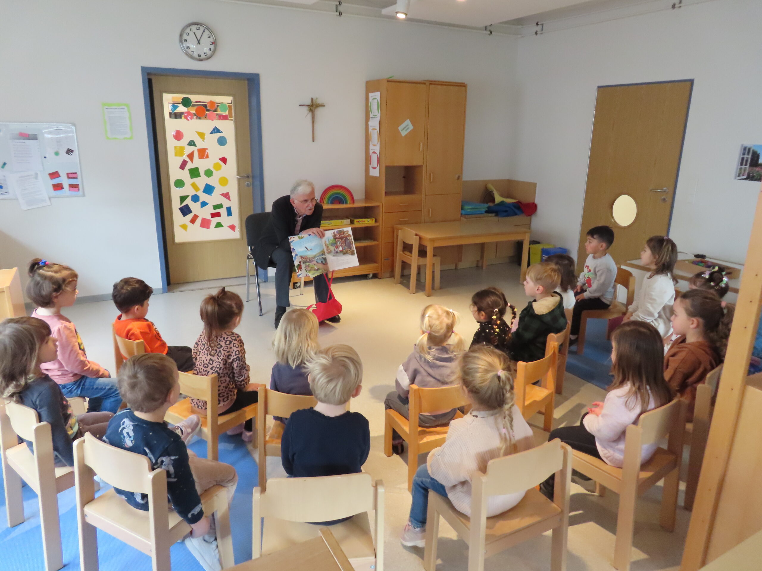 Am 21.11.2025 war der Bundesweite Vorlesetag. Anlässlich dieses Tages kam Pater Werner zu uns in die Kita und hat dem gelben Jahrgang (3-4 Jährige) eine Geschichte vorgelesen. Zusätzlich hat er einige Bücher mitgebracht, die sich die Kinder anschauen und die wir behalten durften. Für die Kinder war es ein tolles Erlebnis.